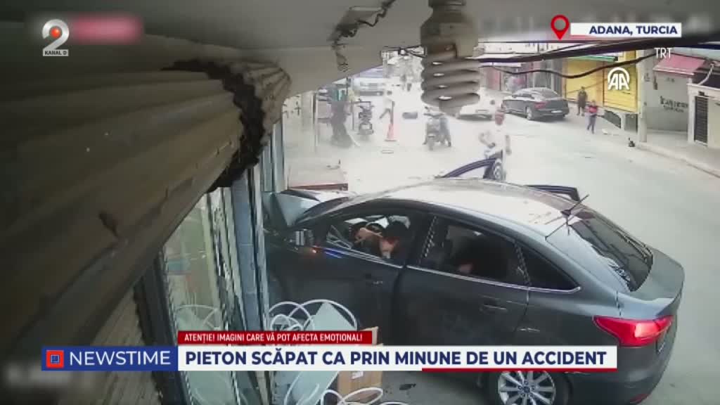 Imaginile arată un bărbat care se afla pe trotuar, uitându-se la telefon, când o mașină scăpată de sub control a intrat brusc pe trotuar și a pătruns într-un magazin din zonă. Din fericire, pietonul a reușit să se ferească în ultimul moment, evitând astfel o tragedie.